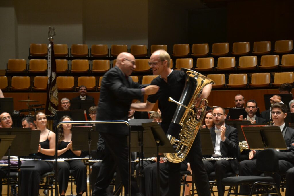 In addition, he appeared as guest conductor at the congress’s main concert, which featured the performance of his work «Bandsterix & Tubelix», an original and vibrant concerto for solo tuba and symphonic band. The soloist was the prestigious German tubist Daniel Ridder, accompanied by the Banda Artística Manisense of Manises, an ensemble that captured the theatrical, humorous, and virtuosic character of the piece with great precision. The performance was enthusiastically received by the audience, earning a warm and prolonged ovation.